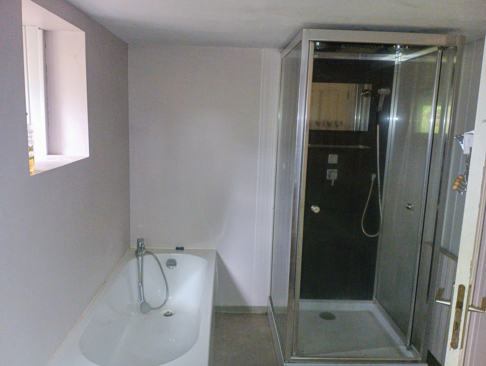 Un wc et une salle de bain d'environ 8 m² constituée d'une baignoire et d'une cabine de douche.