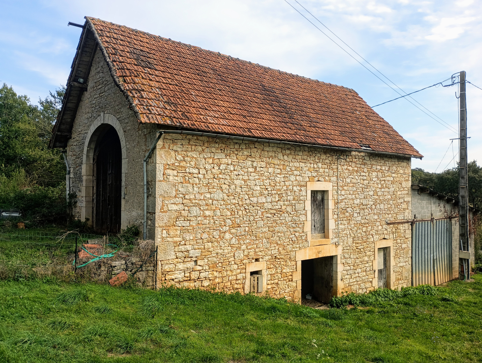 Adossé à la grange, un garage d'environ 50 m², en construction moellons et couverture type tôle d'acier avec dalle béton au sol.